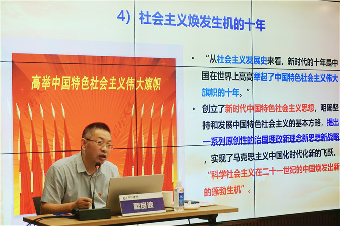 随后,程良波教授以《全面建设社会主义现代化国家、以中国式现代化推进中华民族伟大复兴》为题,从新时代十年的伟大变革与“两个确立”的决定性意义、新时代、新征程中国共产党的中心任务、全面建设社会主义现代化国家的战略部署、全面从严治党,为完成新时代党的使命和任务提供坚强的组织保障四个方面,为大家作了生动讲解。引导与会党员深刻认识新时代十年伟大变革的重大意义,体会习近平新时代中国特色社会主义思想的世界观、方法论和贯穿其中的立场观点方法,整体把握新时代新征程党和国家事业发展的目标任务、战略部署、重大举措,紧密结合本职工作,切实把党的二十大精神落实到位。